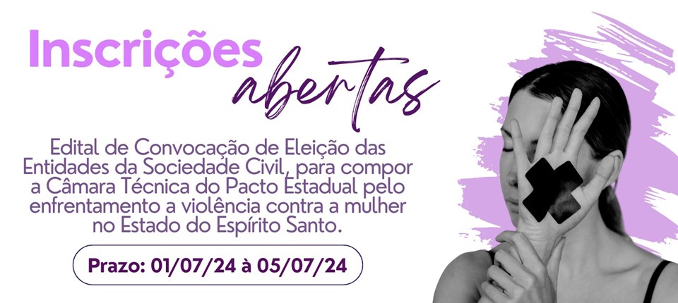 A partir desta segunda-feira (1º) até a próxima sexta-feira (05), entidades representantes da sociedade civil poderão se inscrever para compor a Câmara Técnica do Pacto Estadual pelo Enfrentamento à Violência contra a Mulher no Estado do Espírito Santo.