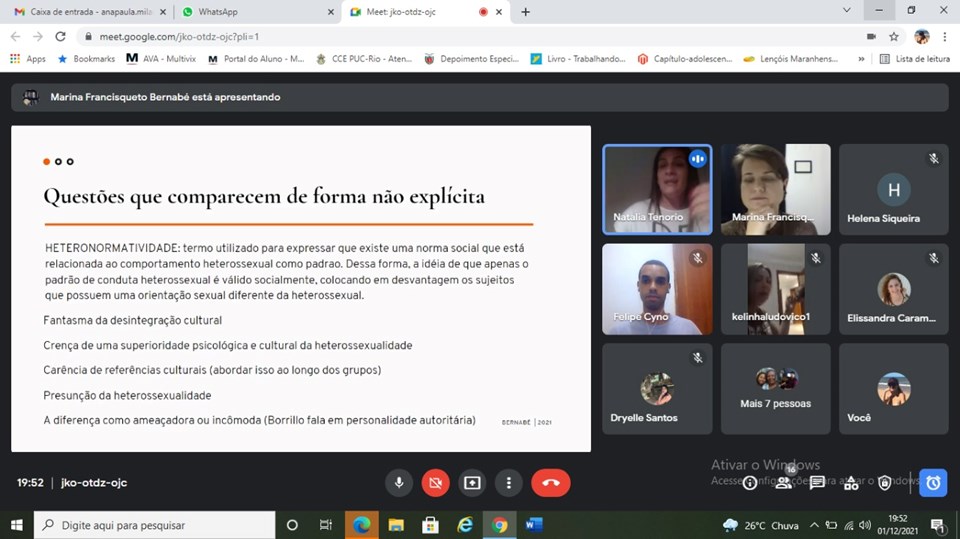A psicóloga Marina Bernabé, que atua na Gerência de Diversidade Sexual e Gênero da Secretaria de Direitos Humanos (SEDH), ministrou uma roda de conversa on-line voltada para delegados, delegadas e corpo técnico que atua no projeto Homem que é Homem, da Polícia Civil do Espírito Santo (PCES). O tema foi “Interlocuções entre masculinidades e LGBTIfobia”.
