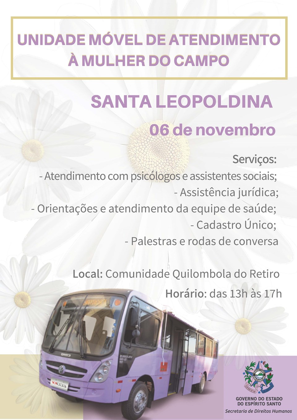 A Unidade Móvel de Atendimento à Mulher do Campo, o Ônibus Lilás, estará no município de Santa Leopoldina, nesta quarta-feira (06), com serviços gratuitos à população. A ação acontece das 13h às 17h, na Comunidade Quilombola do Retiro.