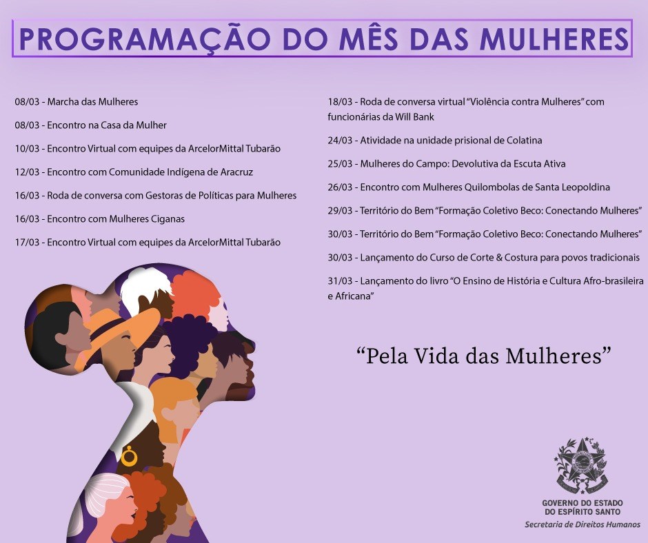 De acordo com a secretária de Estado de Direitos Humanos, Nara Borgo, foi definida uma programação bastante diversificada, voltada para mulheres de vários territórios. “Serão realizadas atividades com mulheres da região metropolitana, do interior, nas comunidades, com indígenas, quilombolas, ciganas, mulheres do sistema prisional. Precisamos estar sempre em contato com todas mulheres, fazendo a escuta ativa, pensando em políticas públicas e lutando pelo enfrentamento da violência”, destacou.