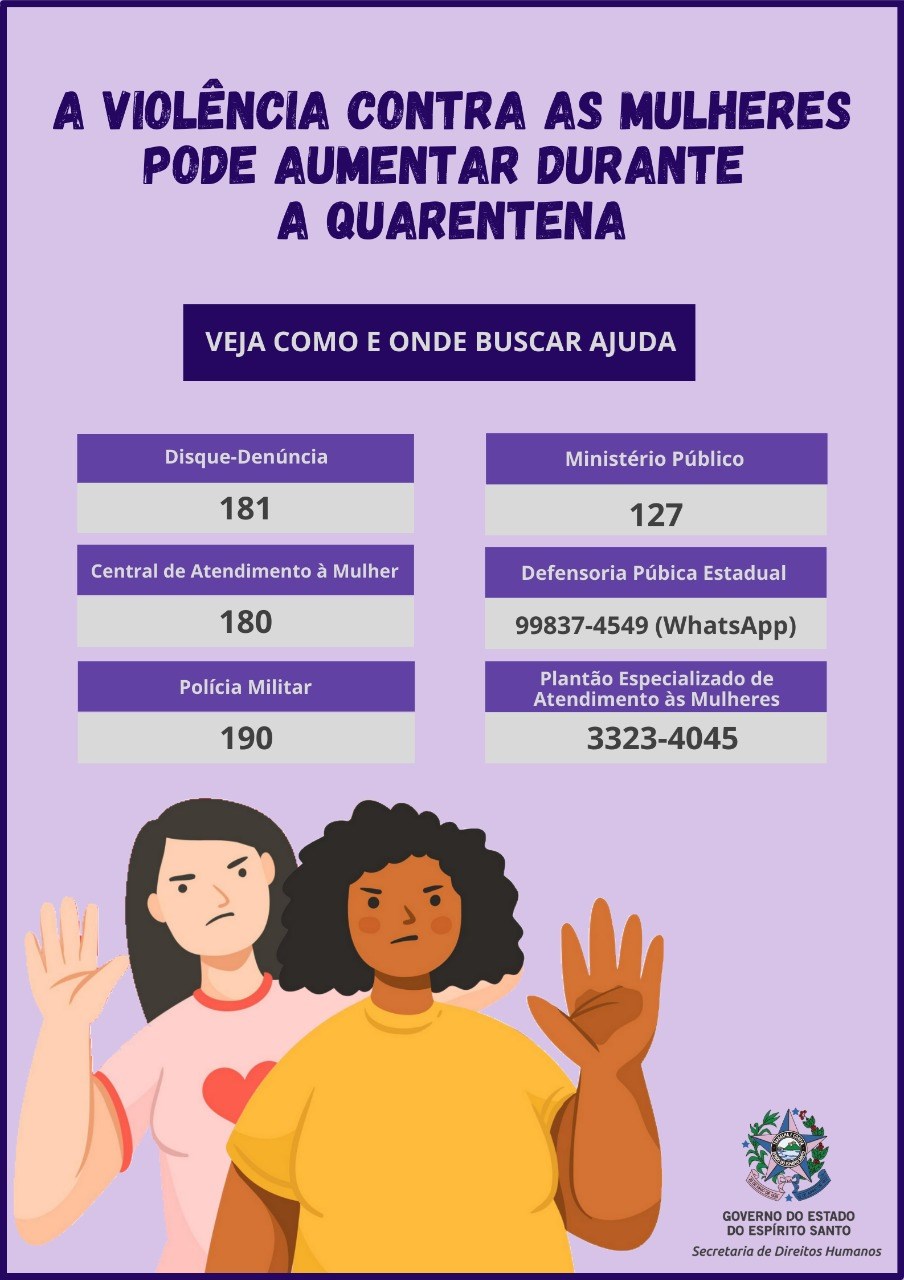 Em conformidade com o Decreto nº 4848-R, o Espírito Santo segue mais uma fase de quarentena por causa do novo Coronavírus (Covid-19), com medidas que culminam no isolamento social para o enfraquecimento do contágio. Entretanto, a Secretaria de Direitos Humanos entende que este é um período em que os casos de violência contra as mulheres podem aumentar, pois elas podem estar confinadas em casa com seus agressores. Confira o informativo completo na galeria abaixo.