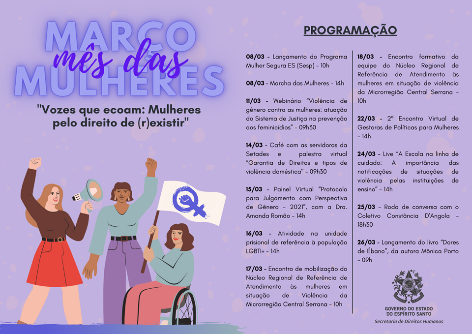 “Serão realizadas atividades com mulheres da Região Metropolitana e do interior, e ainda vamos fazer encontros de mobilização e formação sobre o Núcleo Regional de Referência de Atendimento às Mulheres da Microrregião Central Serrana. Em breve, o equipamento será inaugurado em Santa Maria de Jetibá e vai oferecer atendimento psicossocial e jurídico a mulheres em situação de violência, bem como realizará a articulação da rede de serviços na microrregião”, destacou a secretária Nara Borgo.