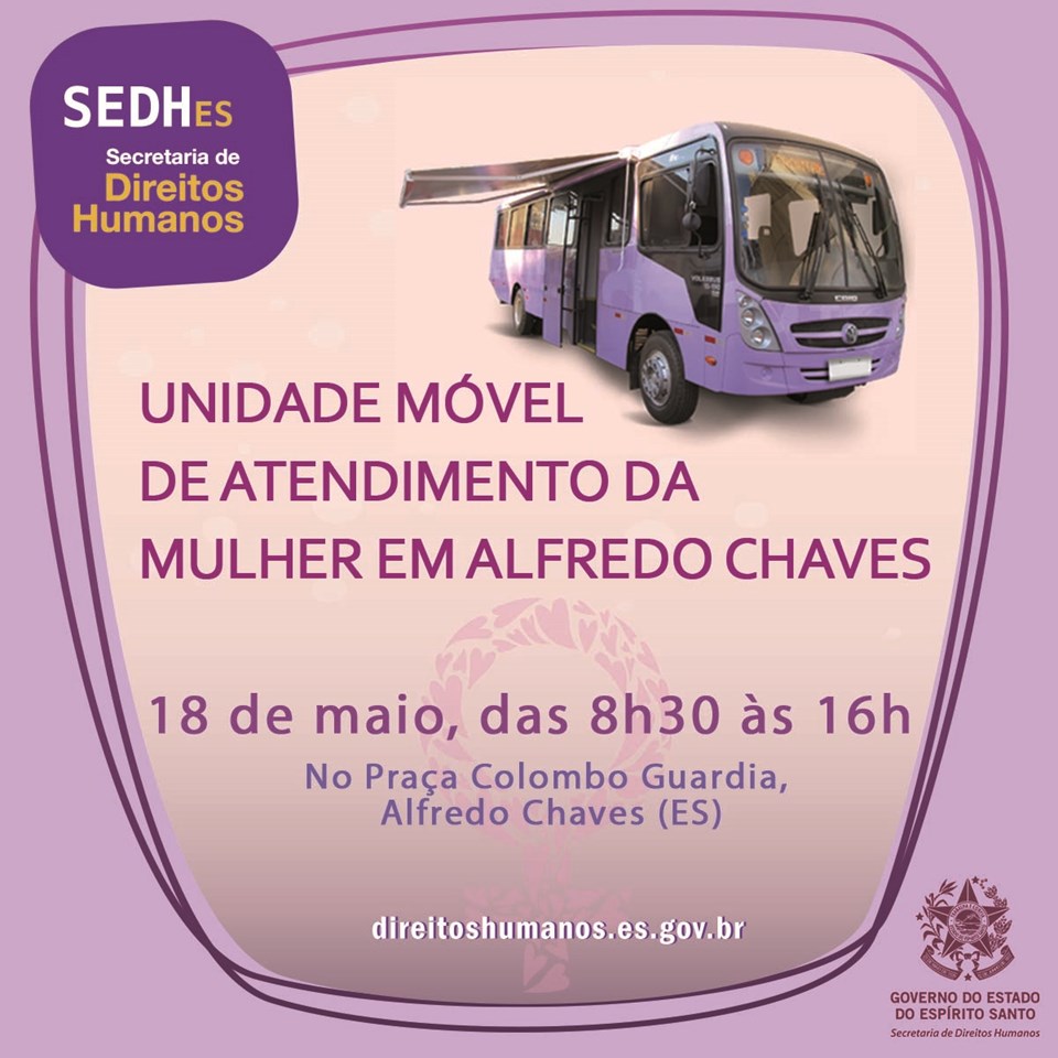 A unidade móvel de atendimento à mulher da Secretaria de Estado e Direitos Humanos (SEDH) estará, nesta sexta-feira (18), no município de Alfredo Chaves, na Região Sul do Estado. O ônibus ficará estacionado na Praça Colombo Guardia, das 08h às 16h, com ações gratuitas para atender a comunidade.